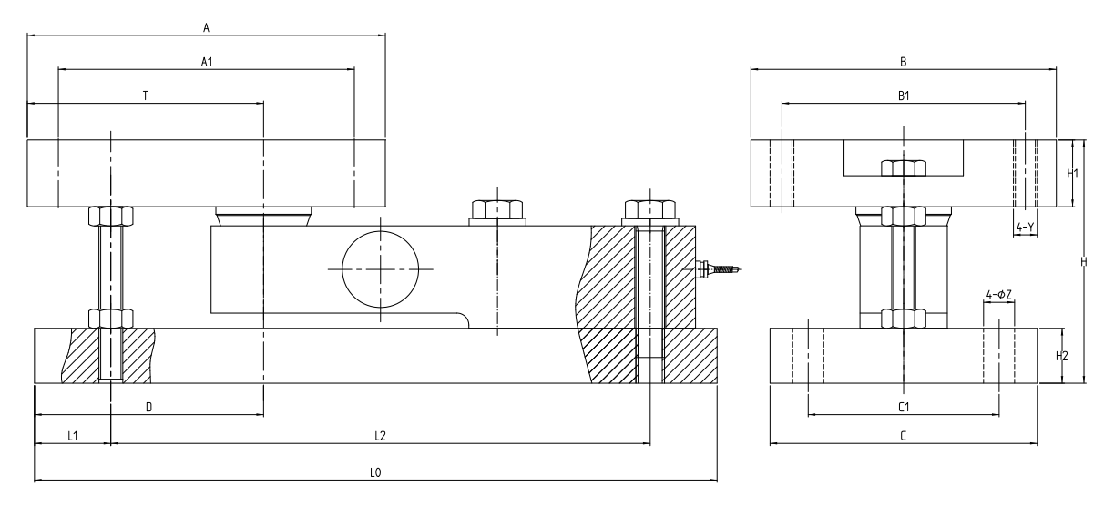 型號 | 量程(t) | A | A1 | B | B1 | L0 | L1 | L2 | C | C1 | H | H1 | H2 | T | D | Y | Z |