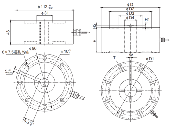 量程(t) | D | D1 | D2 | D3 | D4 | H | H1 | H2 | W | T |